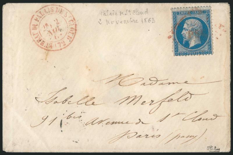 scarce with the red cancel, ex SchatzFRANCE, 1862, 20c Blue (26, Yvert 22). tied by red "PSC" lozenge, matching "Burrau De Palais De St. Cloud 2 Nov. 63" double-circle datestamp on cover to Paris, receiving backstamp, some slight wear, Very Fine, scarce with the red cancel, ex Schatzkes, Calves handstamp at lower right (Image)