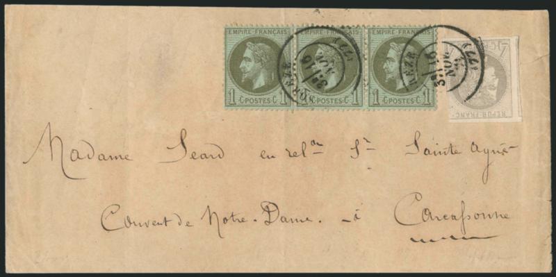 wrapper to Carcassone, receiving backstFRANCE, 1870, 4c Gray (40, Yvert 41B). Report 2, huge margins to in, used with horizontal strip of three of 1c Bronze Green (29, Yvert 27), tied by "Soreze 16 Nov. 71" double-circle datestamp on printed matter wrapper to Carcassone, receiving backstamp, minor wear, Very Fine, scarce usage (Image)