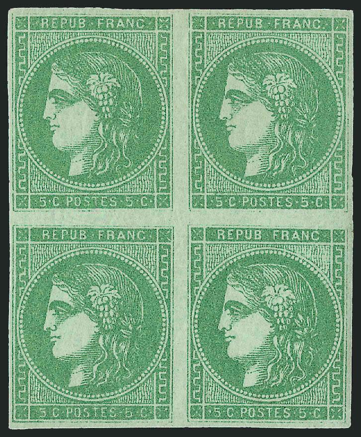 appearance, Yvert e1,750 as block of normal shadFRANCE, 1870, 5c Dark Emerald Green (41, Yvert 42Bb). Positions 9-10/14-14, block of four, original gum, h.r., ample to large margins, pretty shade, top right stamp pinhole and light crease, Very Fine appearance, Yvert e1,750 as block of normal shade, Scott Retail as singles of normal shade (Image)