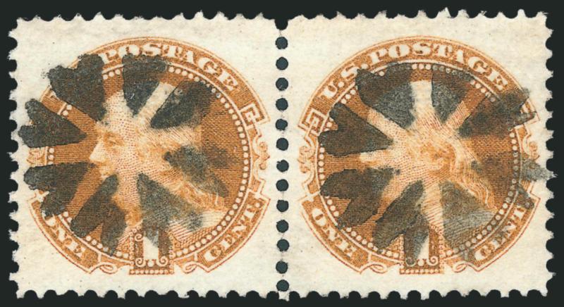 EXTREMELY FINE GEM. A SUPERB USED PAIR OF THE ONE-CENT 1869 PICTORIAL ISSUE WITH CIRCLE OF HEARTS FANCY CANCELLATIONS.