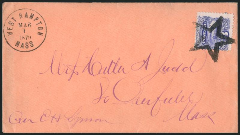 3c Ultramarine (114). Bright color, centered the top left, tied by well-struck Hollow Star fancy cancel, neat strike of "West Hampton Mass. Mar. 1, 1870" circular datestamp on pink cover to South