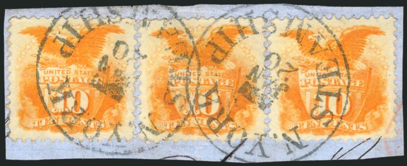crease, Extremely Fine strikes of this des10c Yellow (116). Three singles, vivid color, tied on small blue piece by "N. York Steamship Jan. 20" circular datestamps, right stamp also tied by part of red transit marking, center stamp faint vertical crease, Extremely Fine strikes of this desirable steamship marking, which was applied to mail entering New York, primarily from South and Central America and the Caribbean, multiple frankings such as this are exceedingly scarce, with 2008 P.F. certificate (Image)