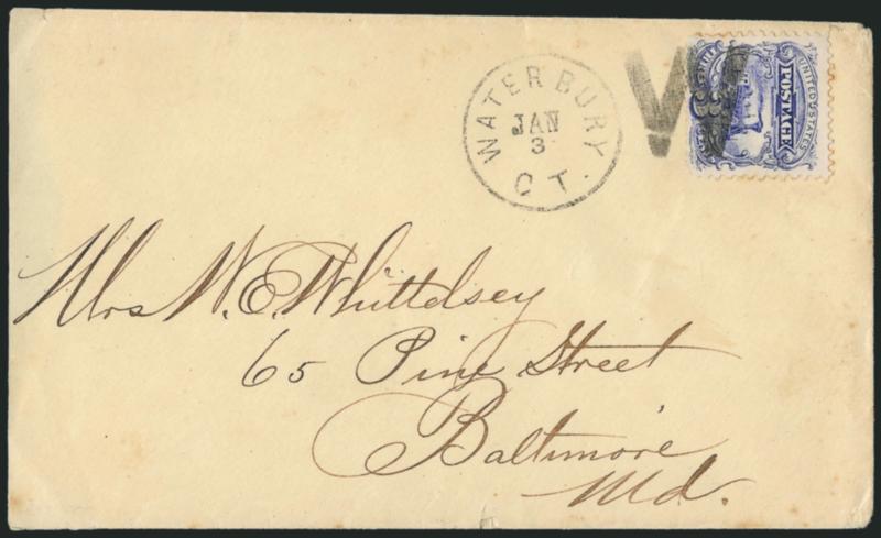 Md., slightly reduced at left, stamp w3c Ultramarine (114). Rich color and detailed impression, tied by bold strike of "W" fancy cancel of Waterbury Conn. (Rohloff K-13), neat "Waterbury Ct. Jan. 3" (1870) circular datestamp on cover to Baltimore Md., slightly reduced at left, stamp with few trivial toned perf tips not mentioned on accompanying certificate, still a Very Fine strike of this Waterbury initial fancy cancel, only five different initials were carved by Postmaster John Hill and were typically used to denote favoritism (a "G" was used for President Garfield and an "H" was carved for President Hayes), with 1990 P.F. certificate (Image)