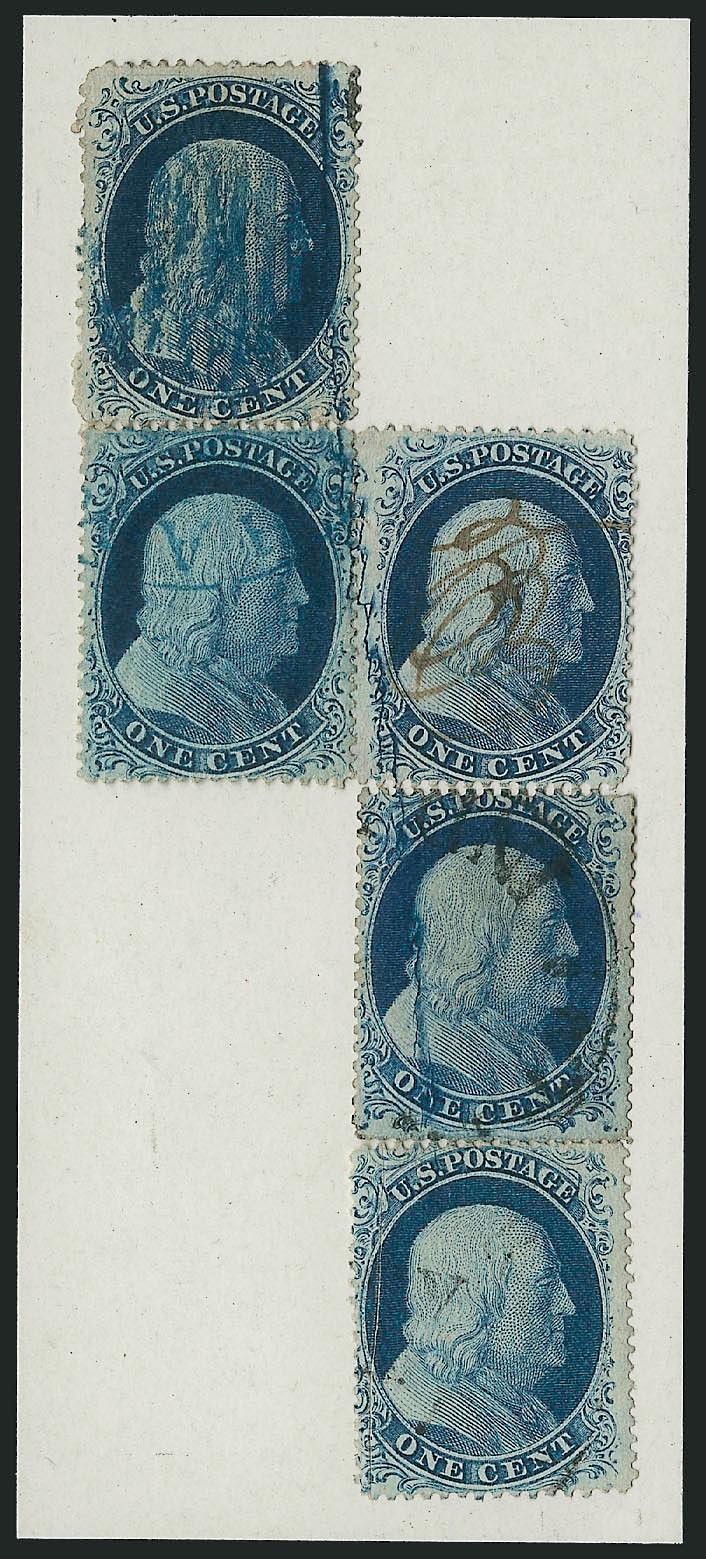 Regarding this block, Ashbrook wrote (personal letter to Neinken): "It is not only very rare but so far as I am aware it is unique... In all my years with the One-Cent I never even heard of a block of four which included any of the Plate 2 crack positions." It is also described and illustrated by Morris Fortgang in his article "The One Cent Stamp of 1857: Types - Varieties - Rarities" (1957 Congress Book, p. 126) and by Neinken in his book (p. 196).