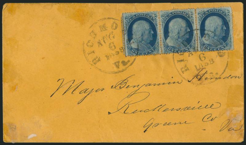 folded letter, a few cover and stamp faults b1c Blue, Ty. Va (24). Four covers, each with one stamp showing centerline, two with strips of three and two with singles, both strips Positions 21-23R5, singles Positions 51R5 and 81R5, one single on a folded letter, a few cover and stamp faults but overall Fine-Very Fine, scarce group of Type Va centerline positions on cover, Scott Retail as off-cover singles with no premium for the positions, all ex Neinken (Image)