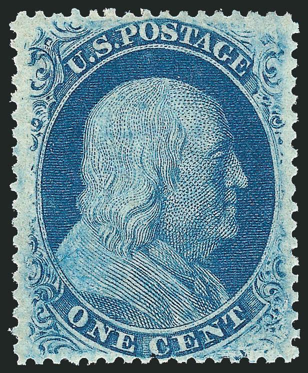 original-gum example from Plate 5, while1c Blue, Ty. V (24). Position 85L5, original gum (described as slightly disturbed on certificate, but it looks undisturbed to us), vibrant color and choice centering, Extremely Fine, a beautiful and desirable original-gum example from Plate 5, while the Scott Catalogue differentiates among the scarcer plates in pricing other types of the 1c 1851-57 stamps, it prices all Type V stamps from Plates 5 and 7-10 the same, despite the fact that Type V stamps from Plate 5 are much scarcer than from any other plate -- rarer, in fact, than Type Va stamps from Plate 5, Neinken estimated that there exists one Type V from Plate 5 for every 200 Type V's from Plate 8 alone (p. 323), with 1998 P.F. certificate stating gum "slightly disturbed" (Image)