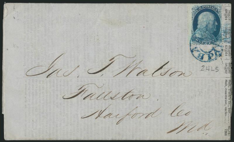 use from Plate 5, accompanied by an Ashb1c Blue, Ty. V (24). Position 24L5, margins to just in, bright color, tied by blue "Balto. Paid" double-circle handstamp on four-page Jan. 2, 1858 Baltimore prices current to Fallston Md., Fine and an early use from Plate 5, accompanied by an Ashbrook photograph where he incorrectly attributes the stamp to Plate 6, ex Neinken (Image)