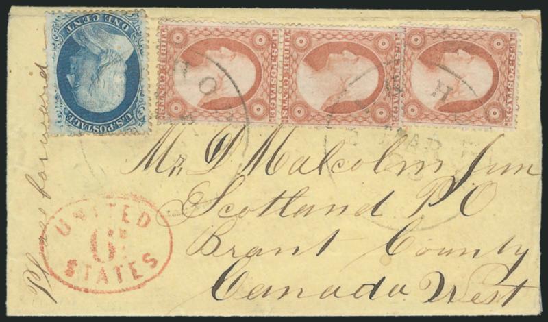 <Scotland P.O., Canada West,> red United1c Blue, Ty. Va (24). Position 53R5, used with vertical pair and single of 3c Dull Red, Ty. IV (26A), all stamps tied by light strikes of "Elkhorn Wis. Mar. 23" circular datestamp on small yellow cover to Scotland P.O., Canada West, red "United States 6d" in oval handstamp, transit and receiving datestamps on back, some minor wear, Very Fine and attractive combination of the scarce 1c Type Va and 3c Type IV stamps on cover (Image)