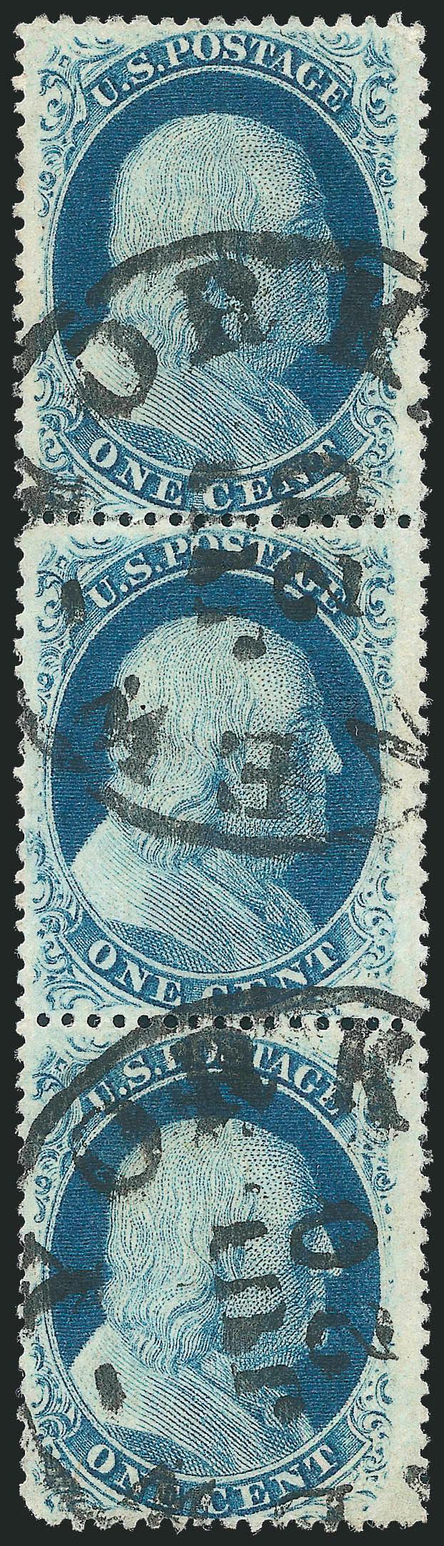 EXTREMELY FINE. AN OUTSTANDING TYPE V-Va-Va COMBINATION STRIP FROM THE LEFT PANE OF PLATE FIVE. ONE OF THE TRULY RARE -- AND UNDER-APPRECIATED -- COMBINATION MULTIPLES FROM THE CLASSIC PERIOD.