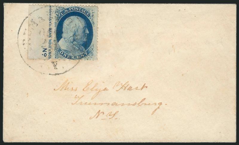 scarce, ex Neinken1c Blue, Ty. V (24). Position 41L9 with part imprint and "No." in selvage at left, tied by "Trumansburg N.Y. Oct. 2?" circular datestamp on locally addressed cover, expertly repaired, Very Fine appearance, scarce, ex Neinken (Image)