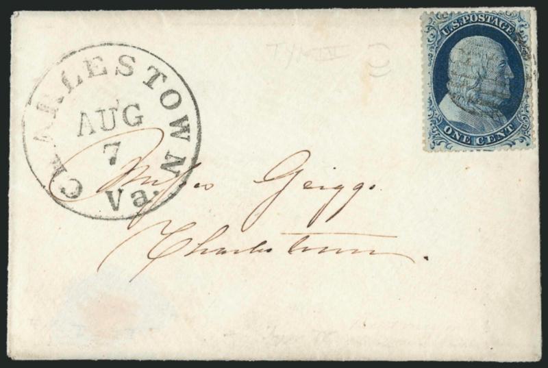 local addressee, with original contents, s1c Blue, Ty. IV (23). Position 24L1L with double transfer, recut once at top and twice at bottom (21 such on plate), rich color, tied by grid, "Charlestown Va. Aug. 7" circular datestamp on small cover to local addressee, with original contents, small cover repair at lower left is barely noticeable, Very Fine, Scott Retail with no premium for the double transfer (Image)