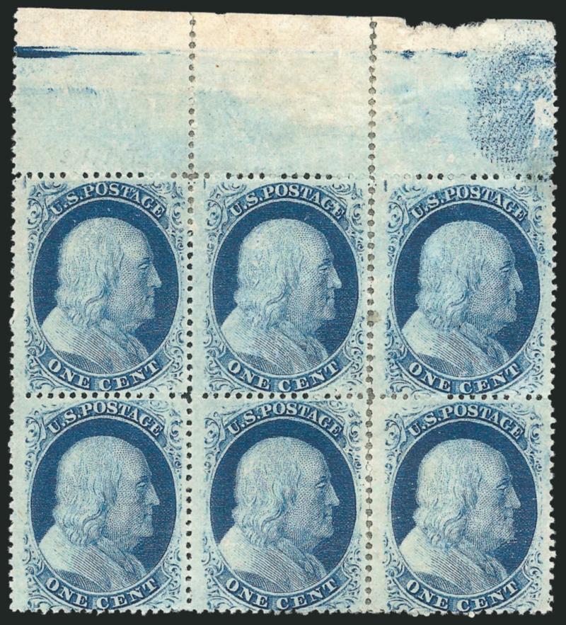 vertical pair separated and rejoined, small tra1c Blue, Ty. V (24). Positions 8-10/18-20R8, block of six with wide selvage at top, unused (no gum), Positions 8R and 10R double transfers, prominent fingerprint at top right from the pressman, right vertical pair separated and rejoined, small translucency on top right stamp, otherwise Very Fine, ex Neinken (Image)