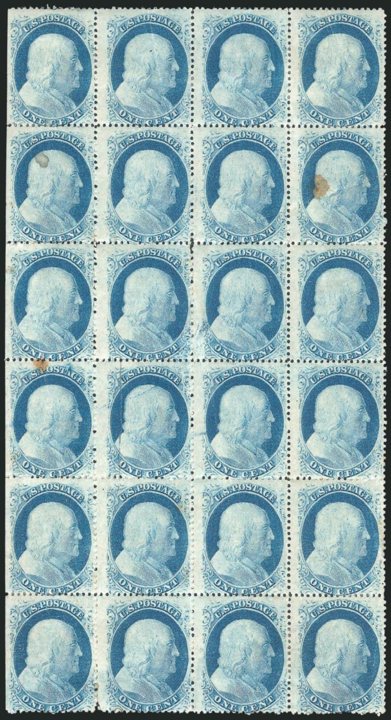 Fine, multiples such as these are ide1c Blue, Ty. V (24). Two multiples from Plate 8, both show plate bruises, unused (no gum), block of 24 from Positions 52-59/62-69/72-79L8, block of 12 from Positions 63-65/73-75/83-85/93-95R8, minor faults, Very Fine, multiples such as these are ideal for showing the different reliefs and plating marks, ex Neinken, Scott Retail for original-gum components is $6,775.00 (Image)