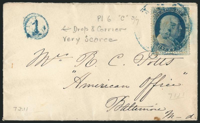 Very Fine, very rare use of 1c 1857 on1c Blue, Ty. V (24). Scissors-separated with some trimmed perfs at top, tied by blue "Baltimore Md. Nov." circular datestamp, matching "1" in circle handstamp on small white cover to local address, fresh and Very Fine, very rare use of 1c 1857 on a carrier/drop-rate combination cover, illustrated in Ashbrook book (Vol. II, p. 150) and Kelly series (CCP, Vol. 51, No. 4, p. 215), ex Golden, with 2000 note from Ken Lawrence stating that the stamp is "probably a coil stamp forerunner...affixed by a Snow patent or similar device" (Image)