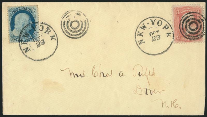 otherwise Very Fine, scarce use of the 1c stamp1c Blue, Ty. V (24). Bright color used with 3c Rose (65), each tied by "New-York Oct. 29" (1861) double-circle datestamps on cover to Dover N.H., barely reduced at right, 3c flaw at top right corner, otherwise Very Fine, scarce use of the 1c stamp in New York City, where the 1861 demonetization order was implemented very late, ex Neinken (Image)