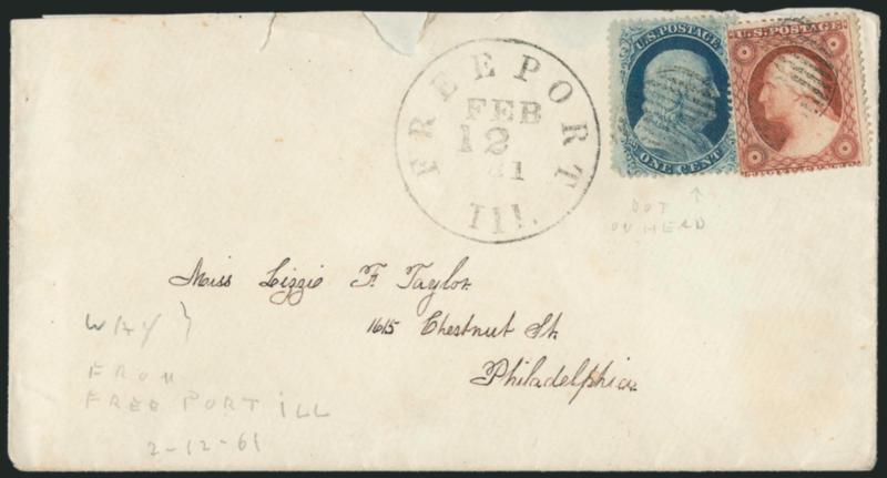 1349 c 1c Blue, Ty. V (24).> Dot on head variety, cancelled by grid and used with <3c Dull Red, Ty. III (26),> similarly tied, on cover to Philadelphia, neat Freeport Ill. Feb. 12, 1861 circular datestamp, missing