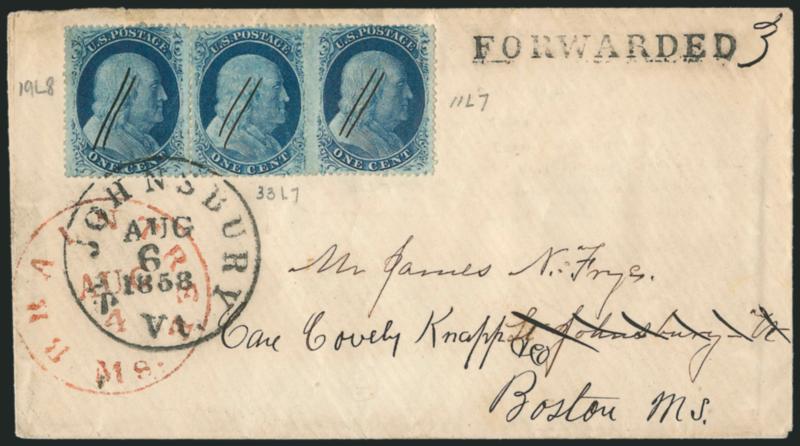 stamps tied by St. Johnsbury Vt. Aug. 6, 181c Blue, Ty. V (24). Three singles, Positions 19L8, 33L7 and 11L7, each cancelled by neat penstrokes, red "Braintree Ms. Aug. 4" circular datestamp on cover to St. Johnsbury Vt. and forwarded to Boston, stamps tied by "St. Johnsbury Vt. Aug. 6, 1858" circular datestamp, matching "Forwarded" handstamp with manuscript "3", Very Fine, unusual use with stamps from two different plates, ex Neinken (Image)