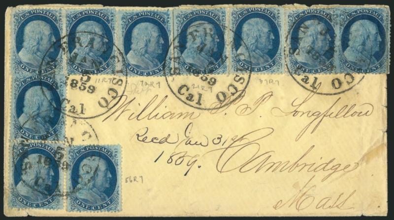 on light yellow cover to William P. P.1c Blue, Ty. V (24). Plate 7, vertical pair and eight singles, plating notes beneath stamps, 21R7 with straddle-pane margin and centerline at left, tied by "San Francisco Cal. Jan. 5, 1859" circular datestamps on light yellow cover to William P. P. Longfellow (nephew of the poet) in Cambridge Mass., some flaws incl. edgewear and stamps affected from placement at edge of cover, still Fine and unusual franking to pay the 10c transcontinental rate, ex Neinken (Image)