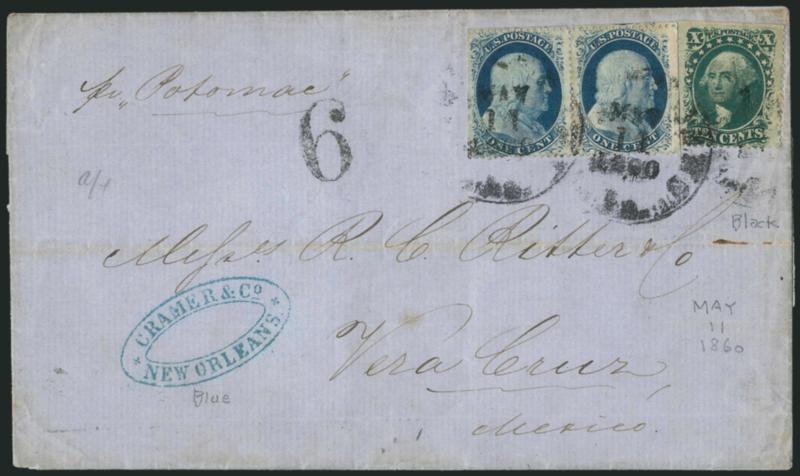 cover <to Vera Cruz, Mexico,> neat 6 re1c Blue, Ty. V (24). Horizontal pair, scissors-separated with perfs at top intact and s.e. at sides, used with 10c Green, Ty. V (35) and tied by "New Orleans La. May 11, 1860" circular datestamps on folded cover to Vera Cruz, Mexico, neat "6" reales due handstamp, horizontal file fold well away from stamps, Very Fine, unusual franking, Ashbrook believed the extra 2c paid a carrier fee in New Orleans, signed Ashbrook, ex Neinken (Image)