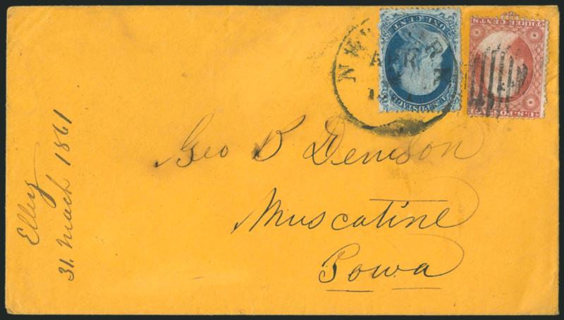 1433 c 1c Blue, Ty. II (20).> Plate 11, T Relief from the top row of the plate, used with <3c Dull Red, Ty. III (26)> and tied by New-York Apr. 25, 1861 circular datestamp with duplex grid on <house carvers and