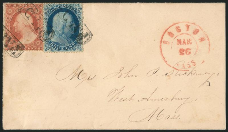1483 c 1c Blue, Ty. IIIa (22).> Plate 11, B Relief, used with <3c Dull Red, Ty. III (26),> both stamps tied by strikes of Paid in frame cancel, red Boston Mass. Mar. 26 double-circle datestamp on cover to West