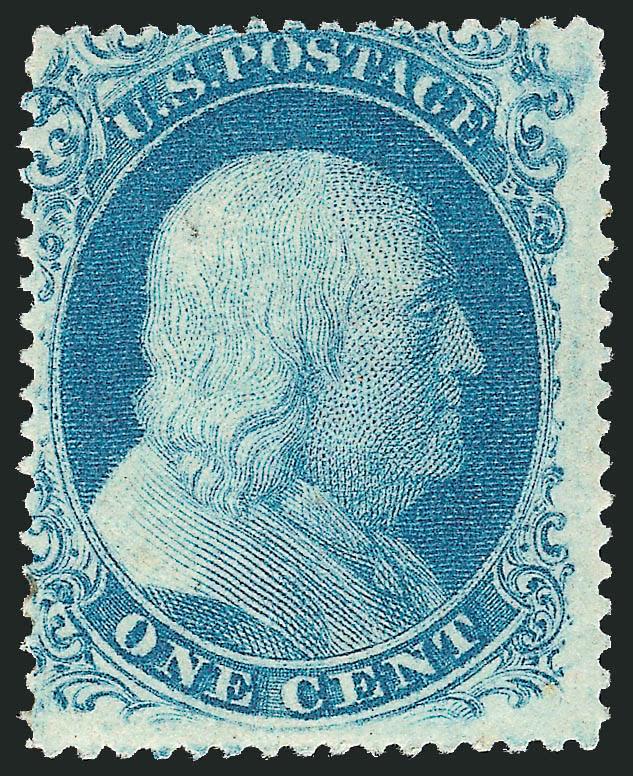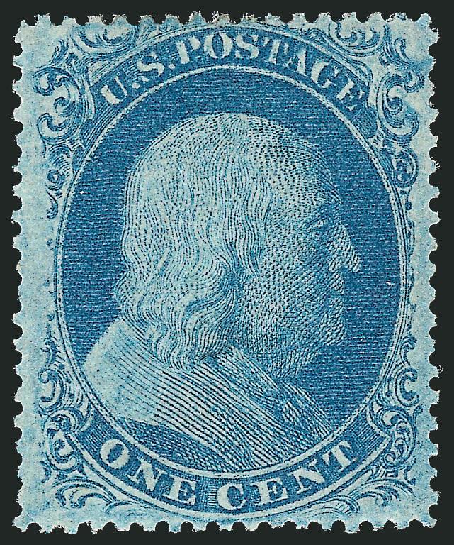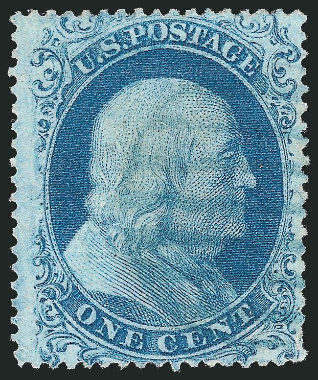 transfer which is mentioned in the Neinken b1c Blue, Ty. II (20). Position 74R12 with major double transfer at top, original gum, rich color, accompanying certificate states soiled but we fail to see this, Very Fine and choice, a desirable double transfer which is mentioned in the Neinken book (p. 492): "I doubt if any other stamp from any of the other eleven plates shows any better example of a doubled top line as 74R12 exhibits", with 1981 P.F. certificate, Scott Retail with no premium for the double transfer (Image)