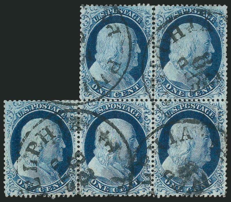 each stamp perfectly centered, dark shade and fine impression, four neat strikes of "Philadelphia Pa. Sep. 28" (1857) circular datestamp, completely sound with perforations fully intactEXTREMELY FINE GEM CONDITION. THE LARGEST RECORDED BLOCK OF