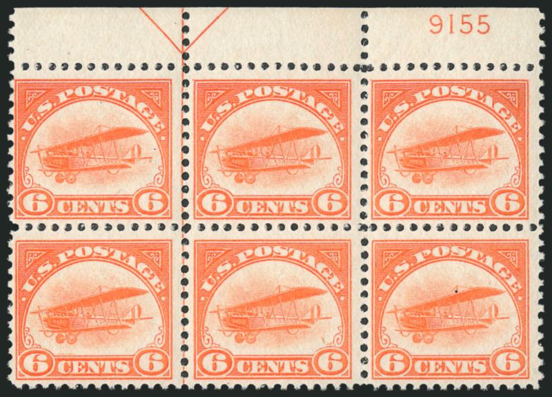 6c Orange, 1918 Air Post (C1). Mint N.H. top arrow and plate no. 9155 block of six, vivid color,