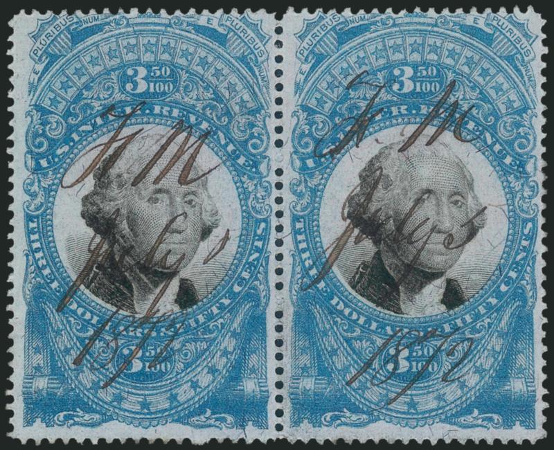 3114   $50.00 Blue & Black, Second Issue (R131).> Horizontal pair, <used with $1.50 Second Issue (R120) and $3.00 and pair of $20.00 Third Issue (R147, R150),> cancelled by <<D. W. B. et al, May 9, 1872>> ms. cancels