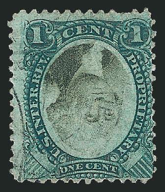 invert, we have offered only one other since 11c Green & Black, Proprietary, Inverted Center (RB1d). Face-free cancel leaves vignette completely visible, small flaws incl. thins and light creases, Fine appearing and collectible example of this rare invert, we have offered only one other since 1993 (Image)