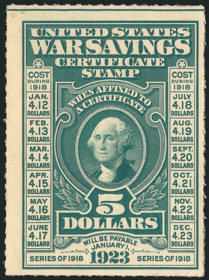 3227 og $5.00 Deep Green, War Savings, Rouletted 7 (WS3).> Lightly hinged, wide margins with guide line at top, Very Fine and choice$5.00 Deep Green, War Savings, Rouletted 7 (WS3). Lightly hinged, wide margins with guide line at top, Very Fine and choice (Image)