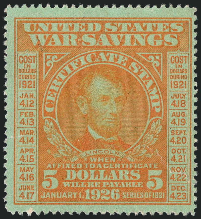 3228 ng $5.00 Orange on Green, War Savings (WS6).> Unused (no gum), vivid color, 13mm tear at lower right, Fine appearance, an affordable example of this rare stamp, Scott Retail as original gum$5.00 Orange on Green, War Savings (WS6). Unused (no gum), vivid color, 13mm tear at lower right, Fine appearance, an affordable example of this rare stamp, Scott Retail as original gum (Image)