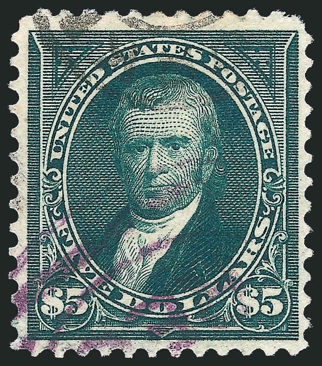 3315   $1.00-$5.00 1895 Issue (276-278).> Deep rich colors on bright paper, clear to wide margins and nice centering throughout, duplex or registry cancels and also purple cancel on $5.00, Very Fine set, each with