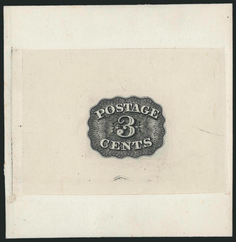 frame line, 36 x 27mm, Very FineBald, Cousland & Co., 3c Die Essay on India, Bond (11-E15a, 11-E16d). Two items, first in Black, die sunk on 76 x 78mm card with full die sinkage, Very Fine, second in Scarlet, with "U.S." at sides and double frame line, 36 x 27mm, Very Fine (Image)