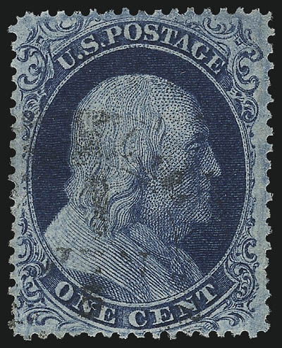 1c Blue, Ty. IIIa (22). Position 50R4, nicely centered, captured part imprint at right, rich color, bold circular datestamp, scissors trimmed at right due to some natural blind perfs, also some trimmed at