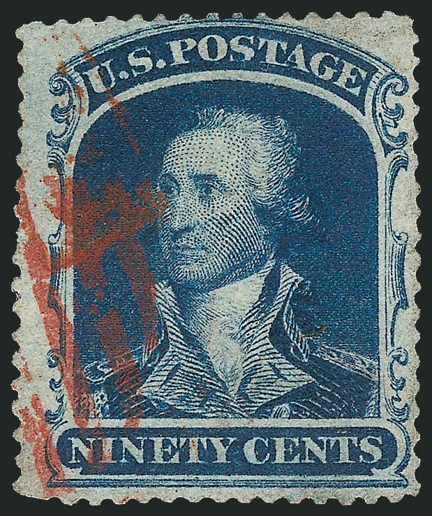 90c Blue (39). Bright shade nicely complemented by red grid cancel used in New York, light horizontal crease, reperfed at rightFINE APPEARANCE. A SCARCE USED EXAMPLE OF THE 90-CENT 1860 ISSUE. With 2010