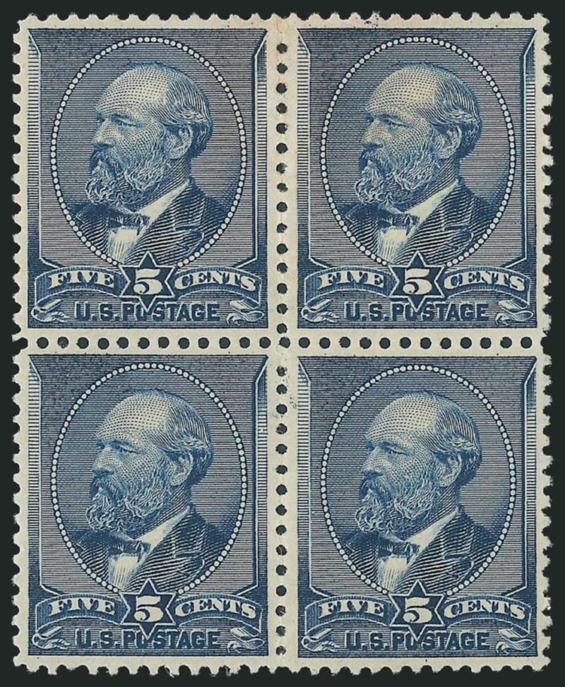as hinged block of four5c Indigo (216). Block of four, original gum, bottom pair faintly hinged if at all, appears Mint N.H., exceptionally well-centered, clear impression, Extremely Fine, with 1980 P.F. certificate, Scott Retail as hinged block of four (Image)