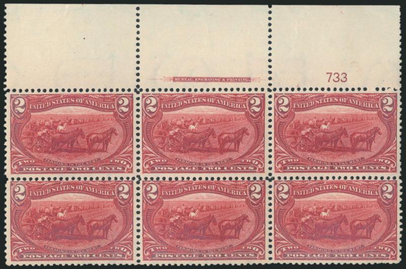 2539 nhbl 2c Trans-Mississippi (286).> Mint N.H. top imprint and plate no. 733 block of six with wide selvage, brilliant color, top right stamp trivial natural inclusion, Fine-Very Fine2c Trans-Mississippi (286). Mint N.H. top imprint and plate no. 733 block of six with wide selvage, brilliant color, top right stamp trivial natural inclusion, Fine-Very Fine (Image)