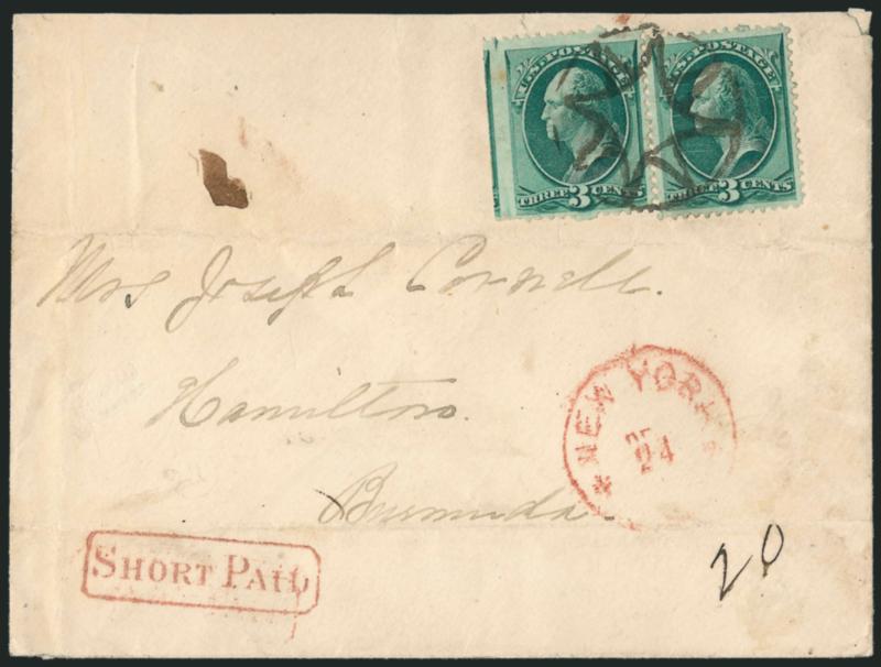 cover <to Hamilton, Bermuda,> red New Y3c Green (158). Two, one with straddle-pane margin showing arrow and part of stamp in adjoining pane, rich color, tied by single clear strike of New York Foreign Mail Star in Circle cancel (Weiss ST-8P6) on cover to Hamilton, Bermuda, red "New York Dec. 24" circular datestamp and matching "SHORT PAID" boxed handstamp, scarce "N.Y.P.O./ONE RATE/ SHORT PAID" three-line handstamp on back, ms. "20" at lower right, two horizontal folds clear of stamps, otherwise Very Fine, an unusual and very scarce cover, Kirke census reports six New York Foreign Mail cancel uses to Bermuda (Image)