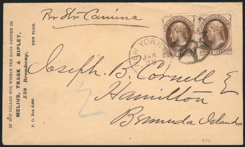 Hamilton, Bermuda,> senders ship name d10c Brown (161). Horizontal pair, tied by partly clear strike of New York Foreign Mail Star in Circle cancel (Weiss ST-8P5) and "New York P.O. Jan. 23" (ca. 1875) circular datestamp on corner card cover to Hamilton, Bermuda, sender's ship name directive "Per Str. Camina", blue crayon "2" double-rate notation, Extremely Fine, immaculate condition and a very scarce cover, Kirke census reports six New York Foreign Mail cancel uses to Bermuda, ex Emerson, Kaplan and Albert (Image)