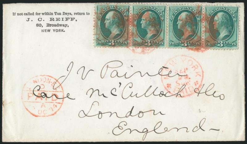 Supplementary Mail> circular datestamp on 183c Green (158). Horizontal strip of four, choice centering, bright shade, tied by three strikes of red New York Foreign Mail Geometric cancel (Weiss GE-C7), matching "New York Paid Sep. 29 Sup." Type E Supplementary Mail circular datestamp on 1874 corner card cover to London, England, addressed to J. V. Painter, discoverer of the 4c Blue Columbian Error, red London "Paid" datestamp, stamp at right has pulled perf, otherwise Extremely Fine, a beautiful Supplementary Mail cover with stamps paying additional 6c fee and cancelled in red, ex Klein (Image)