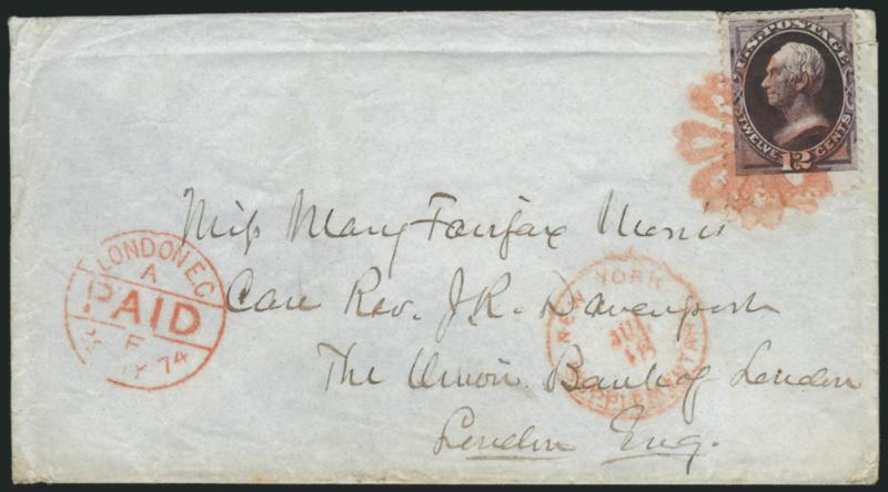 datestamp on cover <to London, England12c Blackish Violet (162). Intense color, tied by bold strike of red New York Foreign Mail Circle of Hearts cancel (Weiss TR-W5), matching "New York Supplementary Jul. 18" Type D Supplementary Mail circular datestamp on cover to London, England, 1874 red London "Paid" datestamp, stamp has light crease and small tear, Very Fine appearance, scarce strike of this New York Foreign Mail cancel in red, with 2006 P.F. certificate (Image)