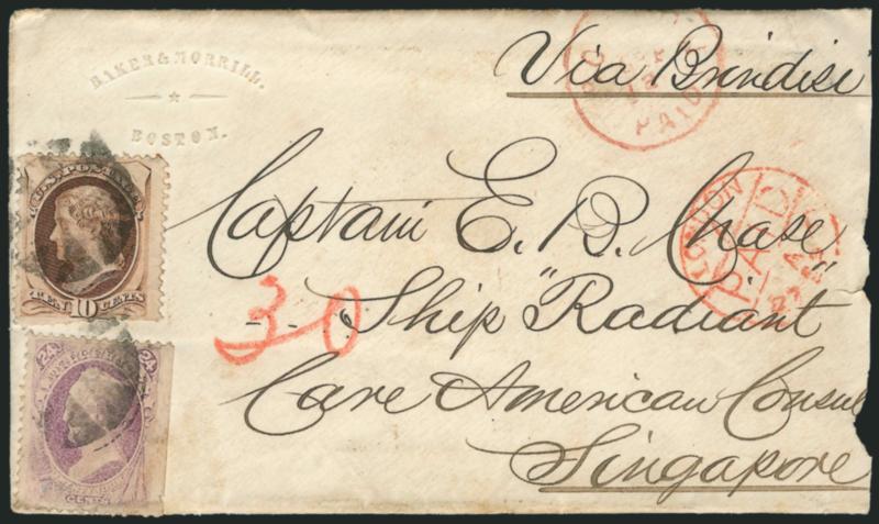 The 34c British Mail rate to Singapore included 4c retained by the United States for postage to England and 30c credited to Great Britain for postage to Singapore within the British mail system. Based on the Boston Sep. 13 and London Sep. 27 postmark dates, this cover was carried on the North German Lloyd's Hansa, departing New York on Sep. 14, and arriving at Southampton on Sep. 27, 1871.