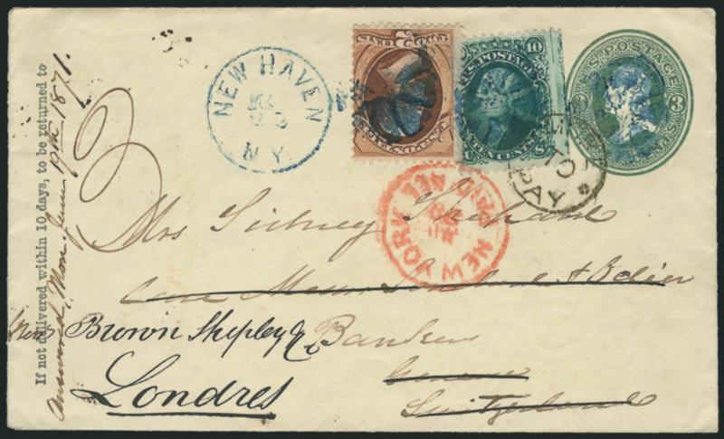 right, tied by <blue> circle of wedges cancel2c Red Brown, Grill (135). H. Grill, clear grill points at center, used with 10c Green (68) on 3c Green entire (U84) to Geneva, Switzerland and forwarded to London, England, 10c straddle-pane margin at right, tied by blue circle of wedges cancel, matching "New Haven N.Y. May 22" (1871) circular datestamp, red "New York Paid All May 29" transit, 10c also tied by "More to Pay" handstamp, receiving backstamps, with original contents, Very Fine, unusual mixed-issue combination, the sender apparently prepaid the old 15c rate (overpaying reduced 10c rate) and the addressee had to pay 3 pence for forwarding (Image)