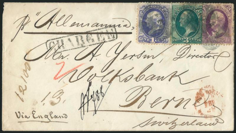 of New York Foreign Mail cancel is new to1c Ultramarine, 3c Green, 24c Purple (145, 147, 153). Three-color combination tied by three strikes of large circular cork cancel with a punch at the center which has put a hole in each stamp -- this type of New York Foreign Mail cancel is new to us and unlisted in the reference books -- red "New York Registered Feb. 28" (1872) rimless datestamp on registered cover to Bern, Switzerland, sender's datestamp on back and ship-name directive "pr 'Allemannia'", red crayon "2" indicating double rate, "CHARGEE" Swiss framed registry handstamp, ms. registry numbers, Swiss transit and receiving backstamps, 1c s.e., stamps have small perf faults in addition to the cuts from punch cancel, otherwise Very Fine (the cover itself is in pristine condition), correctly prepaid for double 10c Swiss Closed Mail rate plus 8c registry fee, a fascinating and very rare cover (we suspect there is more to the story of this unusual punch cancellation) (Image)