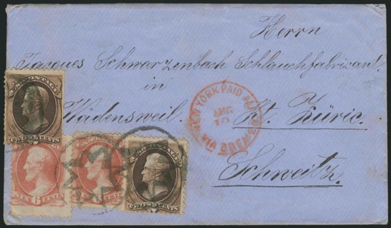 transit datestamp, receiving backstamps,2c Brown, 6c Dull Pink (157, 159). Two of each, tied by well-struck New York Foreign Mail Star cancel (Weiss ST-8P3) on blue cover to Zurich, Switzerland, red "New York Paid All Via Bremen Aug. 19" (1874) transit datestamp, receiving backstamps, one of each slightly affected by placement near edge of cover, Very Fine appearance, correctly prepaid 16c for double 8c Swiss Closed Mail rate via Bremen (much scarcer than the 10c rate via England) (Image)