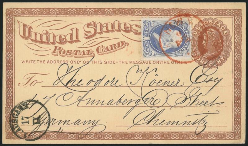 Postal Card (UX1) to Chemnitz, Germany,1c Ultramarine (156). Choice centering and bright shade, wide natural s.e. at right, tied by strongly-impressed red "New York P.O. Sep. 4" foreign-mail exchange office circular datestamp on 1c Brown on Buff Postal Card (UX1) to Chemnitz, Germany, dated 1875, receiving datestamp, Extremely Fine, unusual use of the red datestamp (Image)
