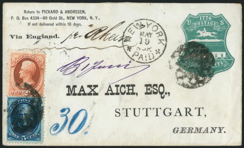 Mail datestamp on 3c Green Centennial ent2c Vermilion, 5c Blue (178, 179). 5c s.e. at left, tied by part strike of well-worn New York Foreign Mail Geometric cancel (Weiss GE-EP2), clear strike of "New York Paid May. 19 Sup." Type E Supplementary Mail datestamp on 3c Green Centennial entire to Stuttgart, Germany, geometric cancel struck again over embossed stamp, corner card with sender's "Via England per Rhein" ship-name directive, receiving backstamp, blue crayon "30" at lower left (unknown meaning), Extremely Fine, a very unusual combination of stamps and markings, probably 1876 use based on cancellation, 5c GPU/UPU rate with 5c Supplementary Mail fee (Image)