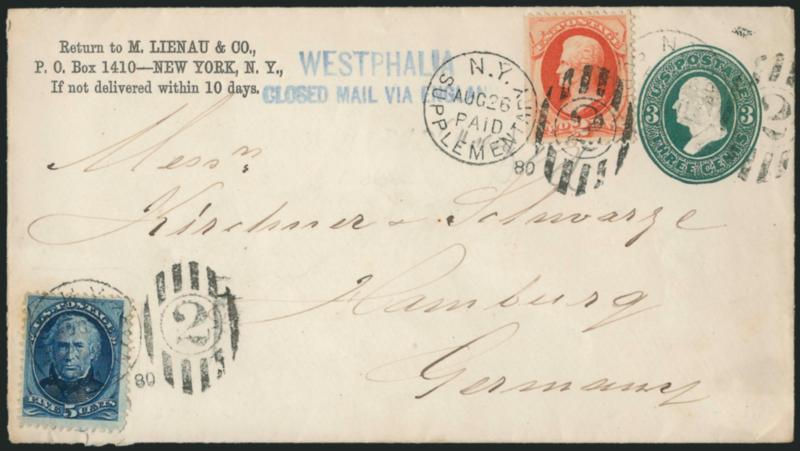 tied by same cancel at lower left, send2c Vermilion, 5c Blue (183, 185). 2c s.e. at left and tied by "N.Y. Supplementary Paid Aug. 26 80" Type F Supplementary Mail duplex datestamp and oval on 3c Green entire to Hamburg, Germany, 5c affixed and tied by same cancel at lower left, sender's corner card and backstamp, matching directive handstamp "Westphalia/Closed Mail via England", Extremely Fine (Image)