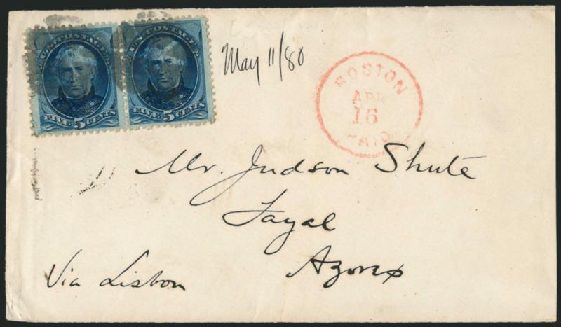 London and Lisbon backstamps, neat recei5c Blue (185). Horizontal pair, deep rich color, choice centering, tied by circle of wedges cancels, red "Boston Paid Apr. 16" (1880) circular datestamp on cover to Fayal, Azores, endorsed "Via Lisbon", London and Lisbon backstamps, neat receipt docketing, fresh and Very Fine, an uncommon destination, even in the UPU period (Image)